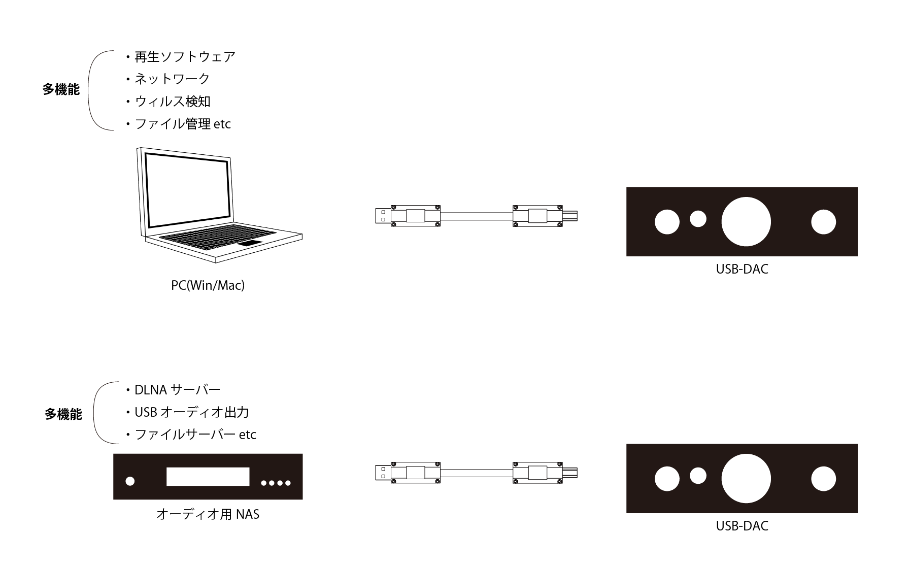 あらゆるDACを最先端のネットワークオーディオプレイヤーに オーディオ用NASは近年、サーバー機能にUSB-DAC出力機能、CDリッピング機能などが追加され、便利で使い勝手が良い方向に発展してきました。しかしながら機能の追加は、機器内部で多くの機能が並行して動作することを意味します。複数機能の並列処理は、オーディオ的観点で言うと大きな問題をはらんでいます。