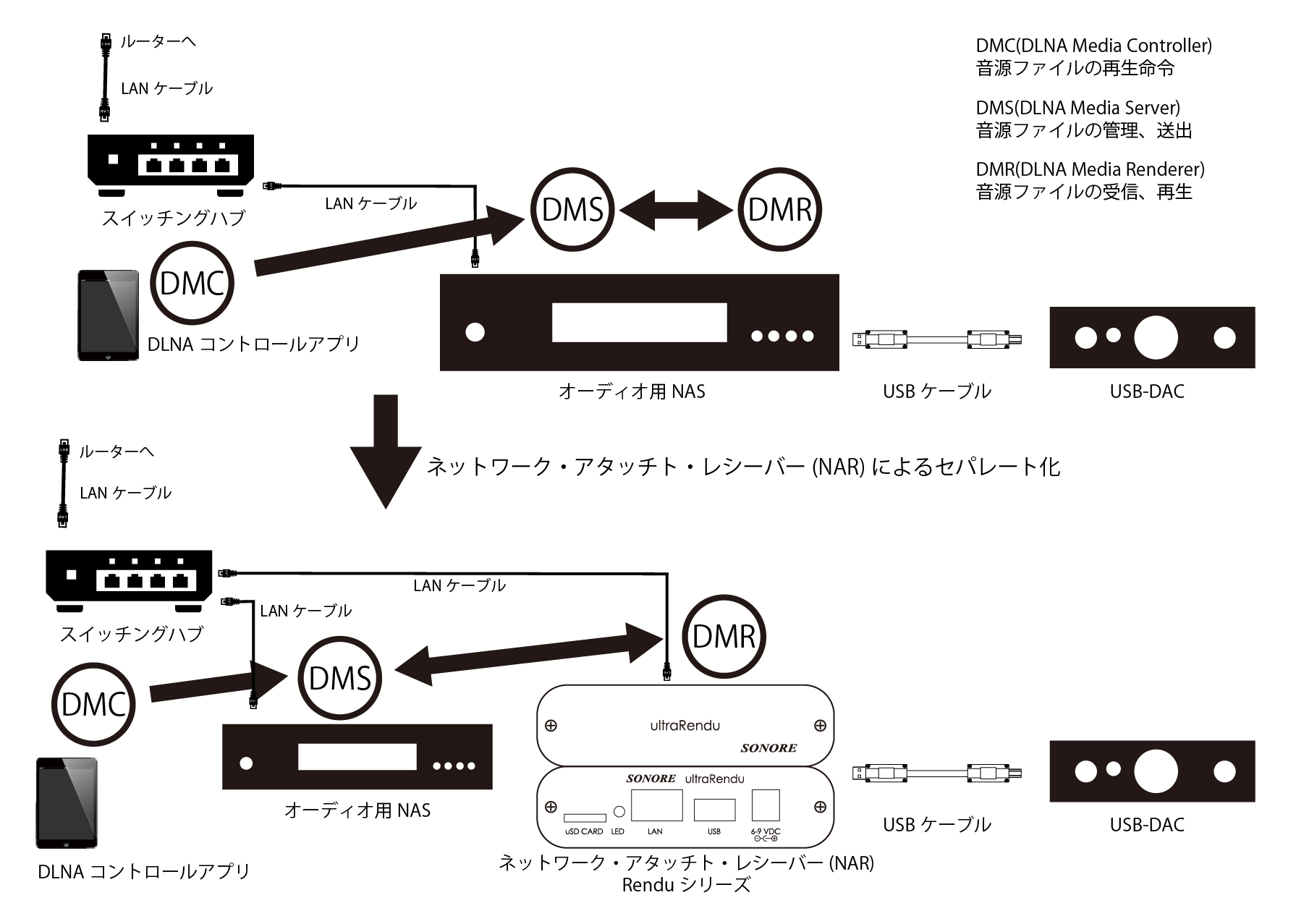 SONOREのネットワーク・アタッチト・レシーバー(NAR=ナル) RenduシリーズはNAS(=ナス)と対になる存在です。NAR RenduシリーズはNASのサーバー機能から音源ファイルを受信し、USB-DACへの音楽ストリームデータ出力に特化しています。多機能かつ便利になったNASの使い勝手をそのままに、音質に最も影響があるUSB-DAC出力部分のみをNAR Renduシリーズが担うことで、NASの機能を分散することができます。つまり、NAR RenduシリーズをNASと併用することで、NAS単体からUSB-DAC出力の音質を向上させることができるのです。