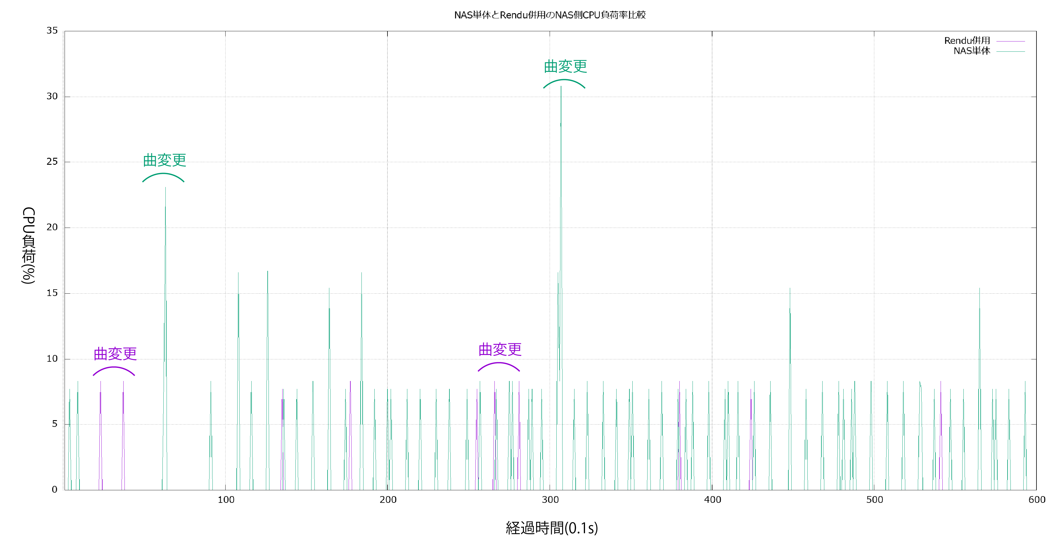 ※DLNA使用におけるNAS側CPU負荷率比較:汎用NAS単体とNAR ultraRendu併用. NAR ultraRenduを使用することで、NAS側の負荷が低下しています。
