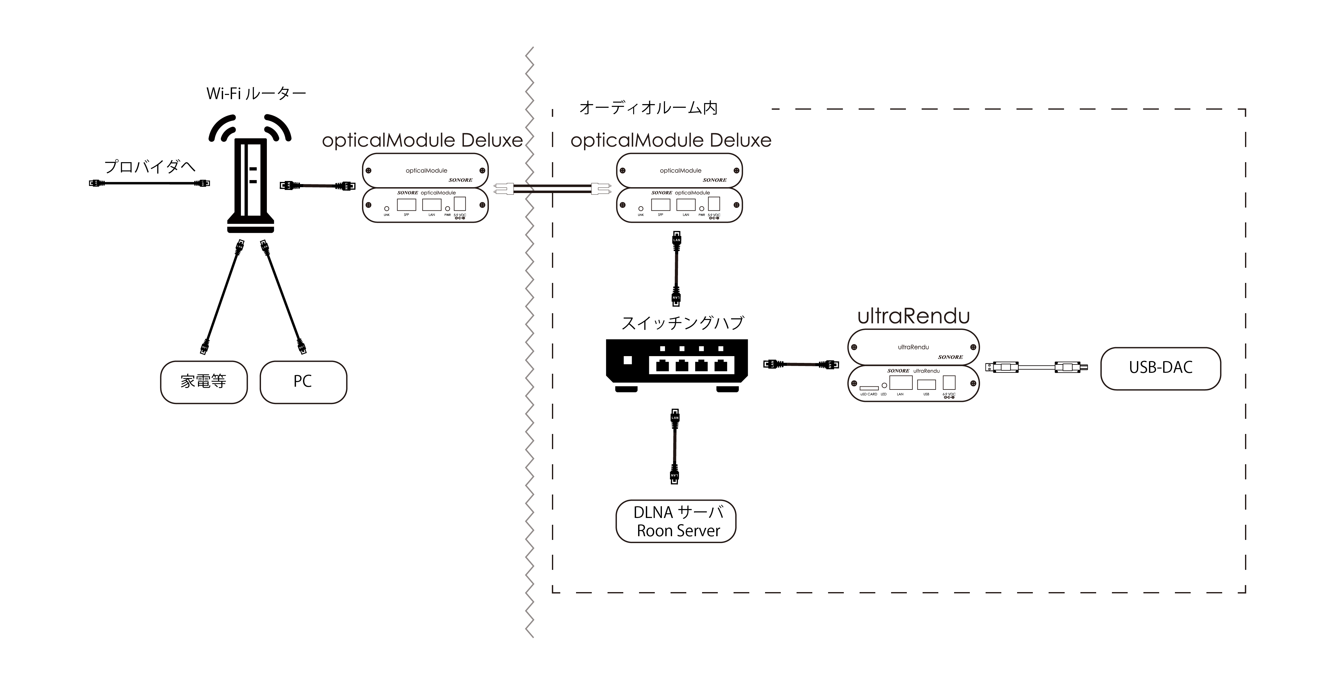 オプティカル・アイソレーションは、光ファイバーによるLAN接続によってネットワークの上流から伝播するノイズを遮断することができます。SONOREのSFPポートを搭載した一連の製品、Signature Rendu SE optical、opticalRendu、opticalModule Deluxe V2を利用します。この接続方法は他Renduシリーズや他社のネットワーク製品、ネットワークオーディオ製品でもシームレスに適用することができます。