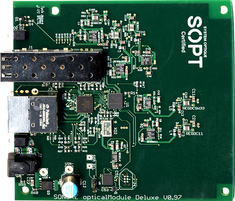 SONORE opticalModule Deluxeは、双方向の光ファイバー(SFP)-LANコンバーターです。opticalModule Deluxeは、光ファイバー(SFP)ポートとLAN(RJ45)ポートを備えています。